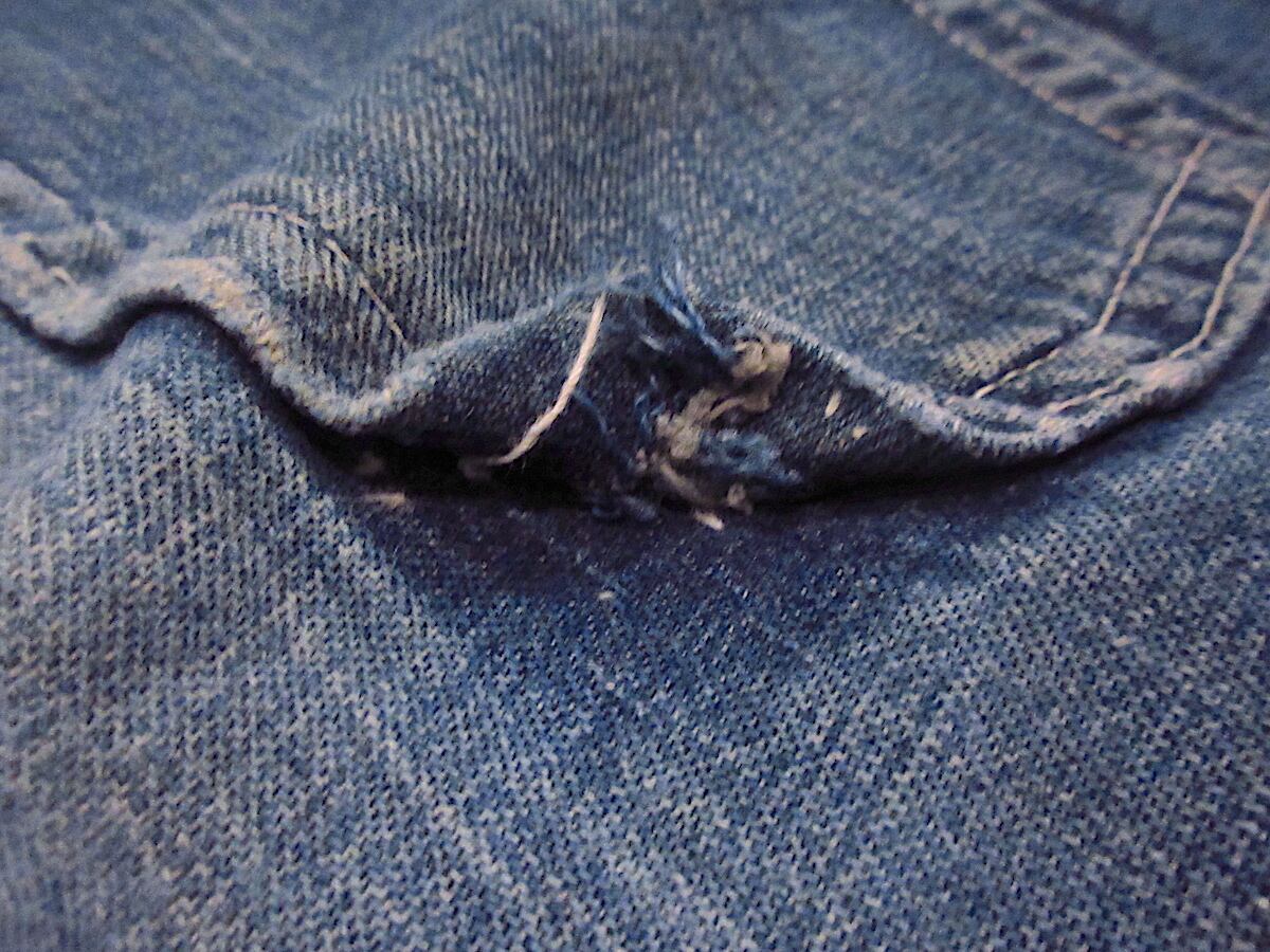 トップのスナップボタン欠損、両膝に接着芯でリペア、尻部分にダメージ、所々にほつれ、小穴、スレ汚れ