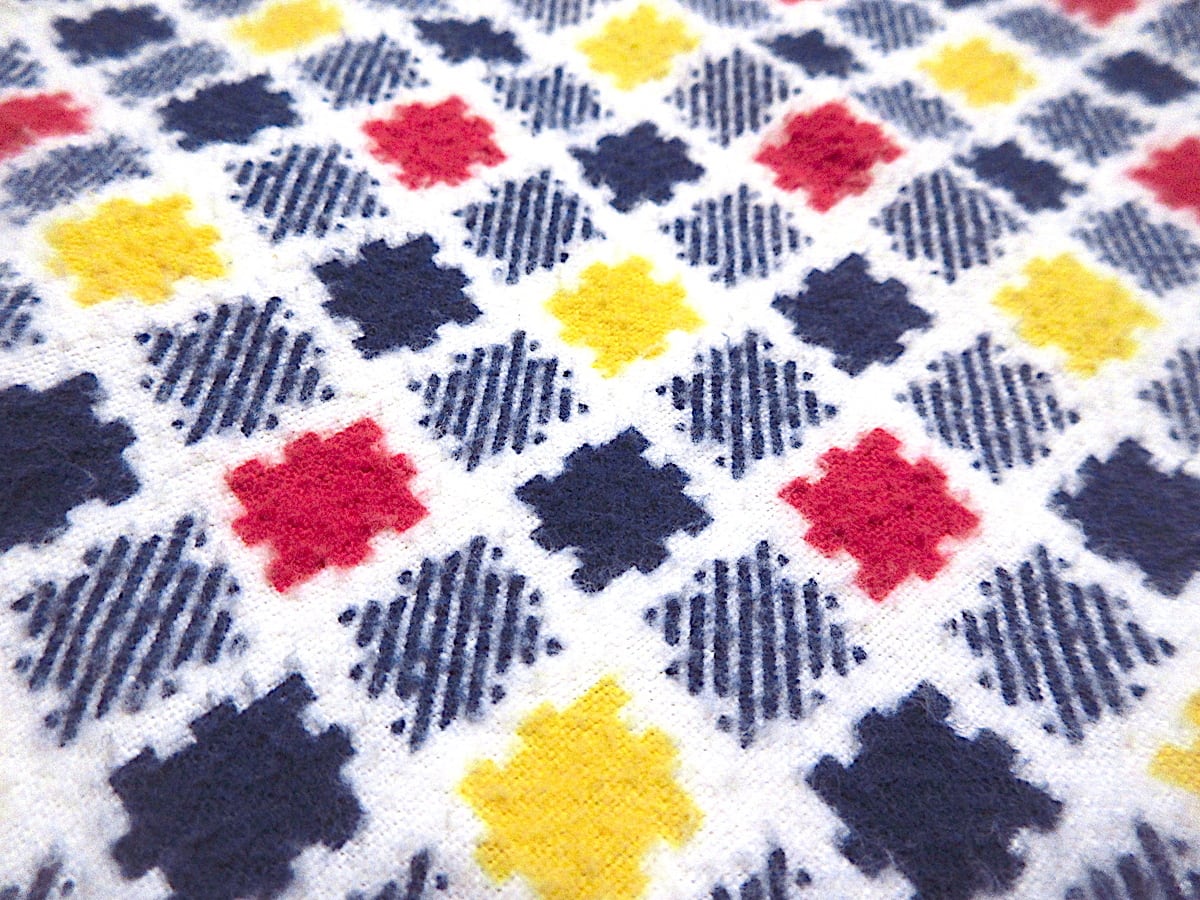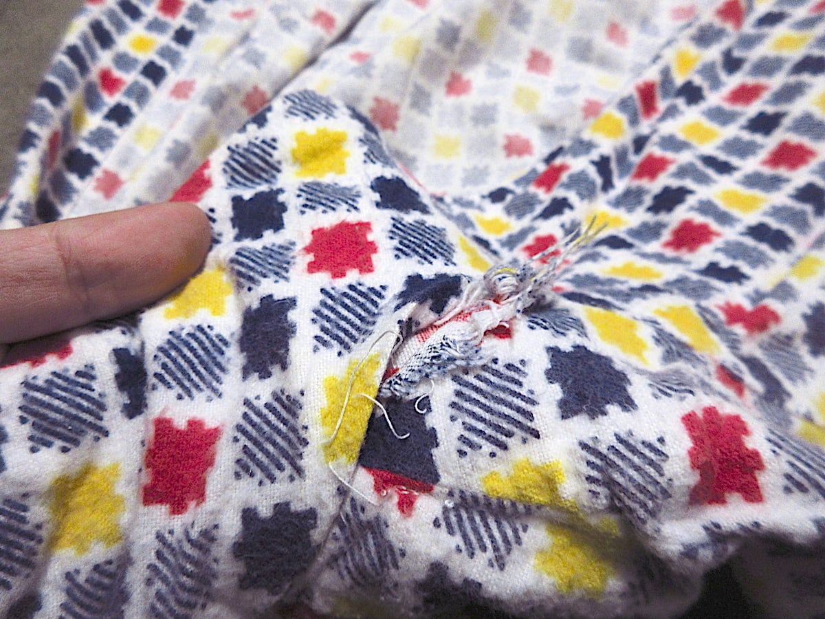 襟元のステッチにほつれ、生地に若干の毛羽立ち