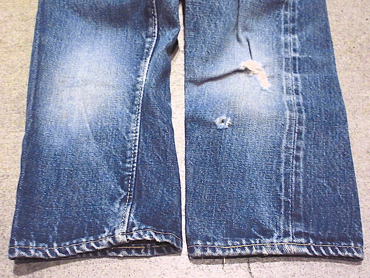 左膝、左もも裏にダメージ、ベルトループにほつれ、アーキュエイトステッチに飛び、全体的にスレ、着用感
