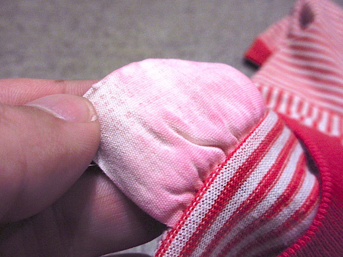 襟にブリーチ跡、所々に小穴、毛羽立ち、色移り