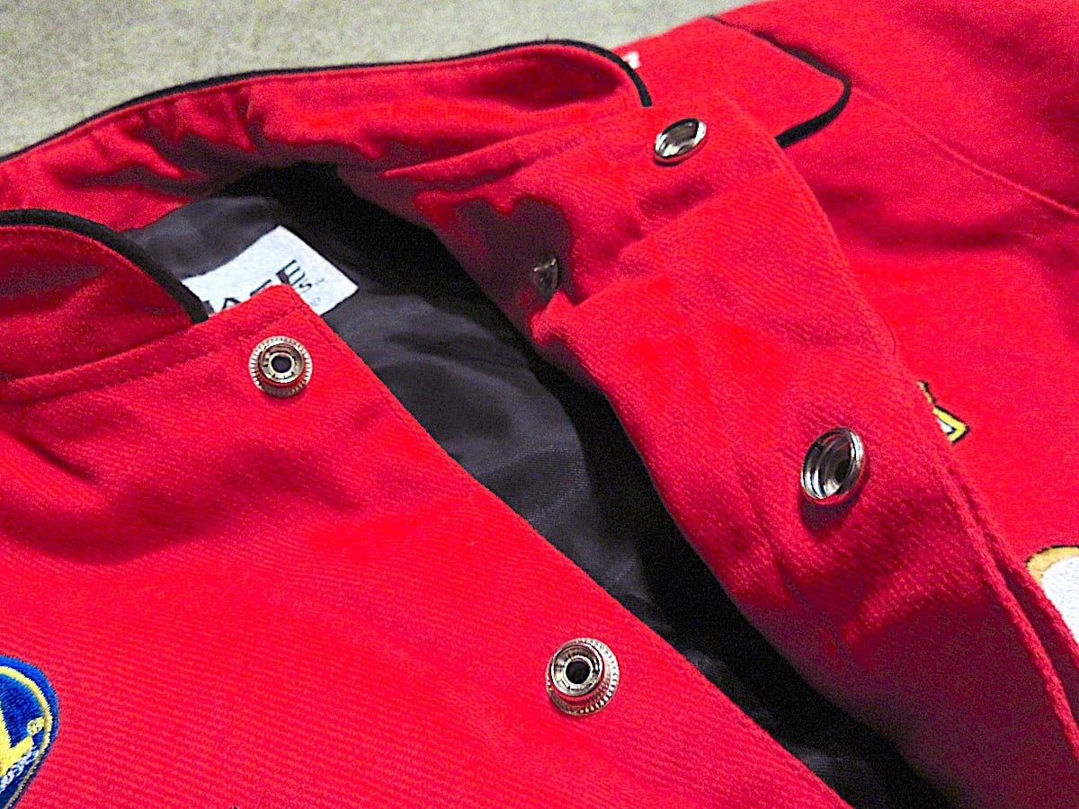 スナップボタン、刺繍、ピンズ付き