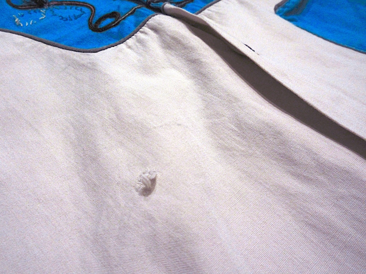 刺繍ステッチにほつれ、左袖ボタン1個欠損、所々に小穴、スレ、あたり、着用感