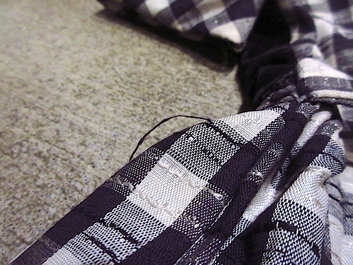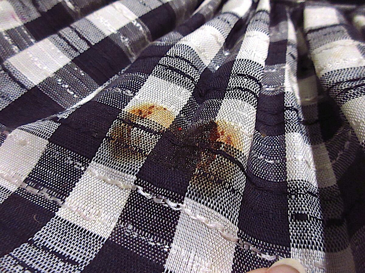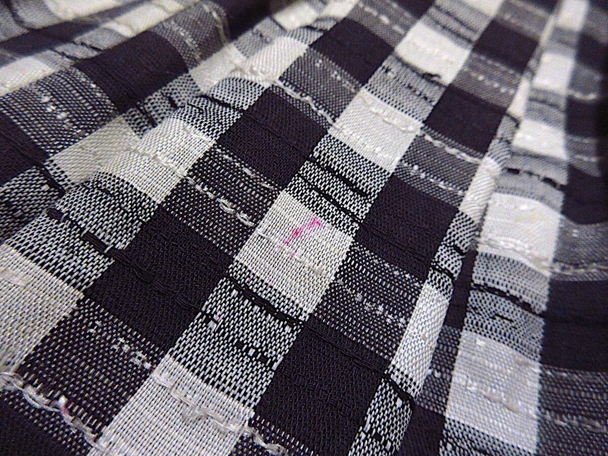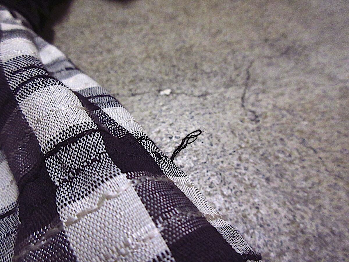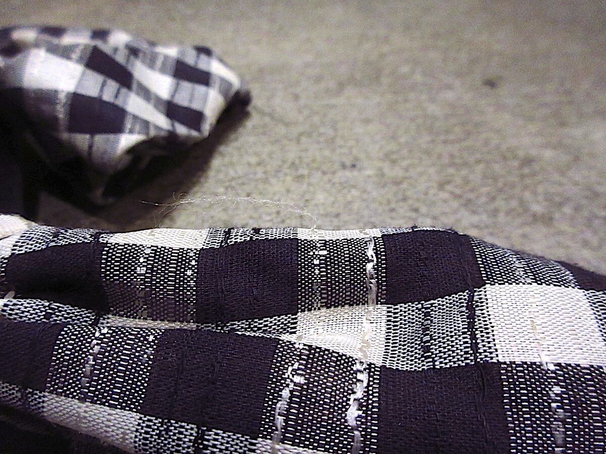 ウエストコードのボタン欠損、コードに安全ピンが付けられている状態、所々に汚れ、ピリング